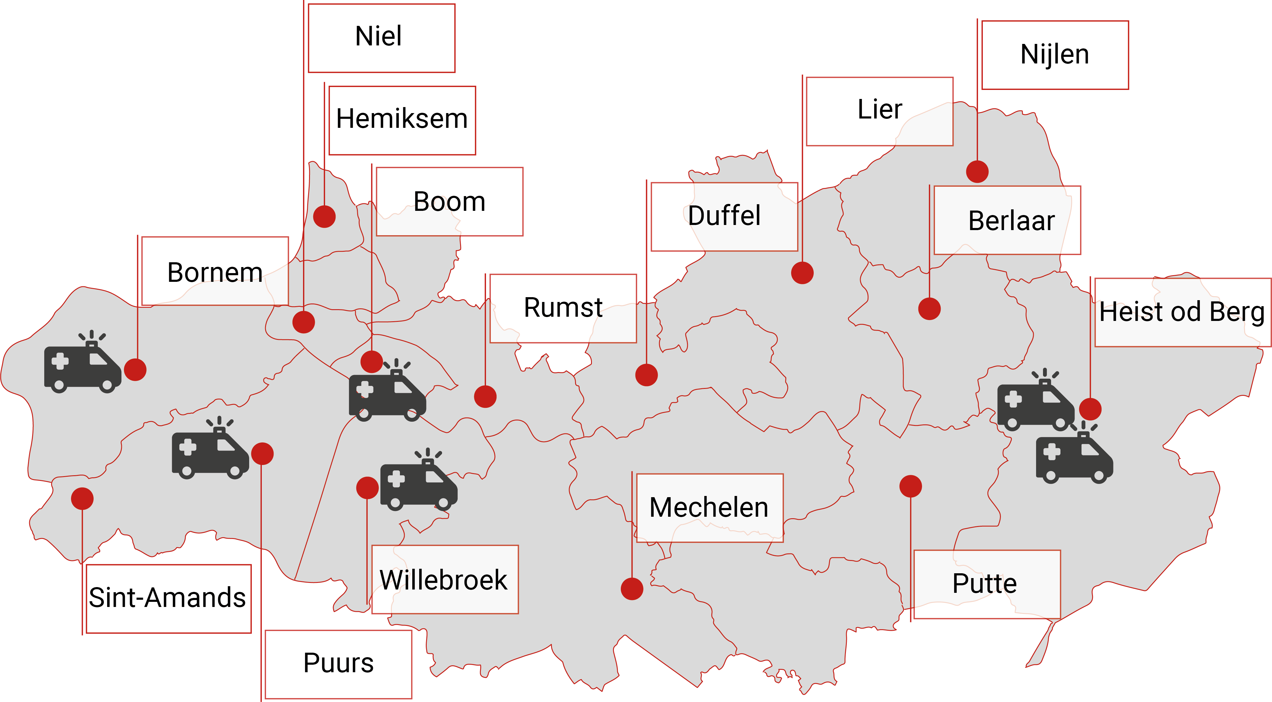 Aartselaar, Berlaar, Bonheiden, Boom, Bornem, Duffel, Heist-op-den-Berg, Hemiksem, Lier, Mechelen, Niel, Nijlen, Putte, Puurs-Sint-Amands, Rumst, Schelle, Sint-Katelijne-Waver, Willebroek.